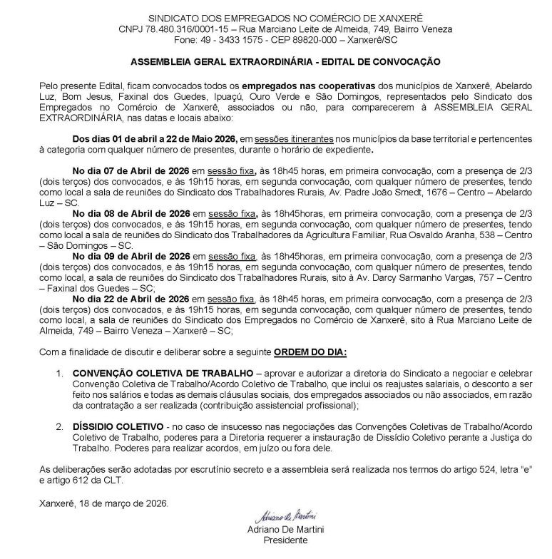 Sindicato dos Empregados no Comércio convoca associados para Assembleia em Xanxerê
