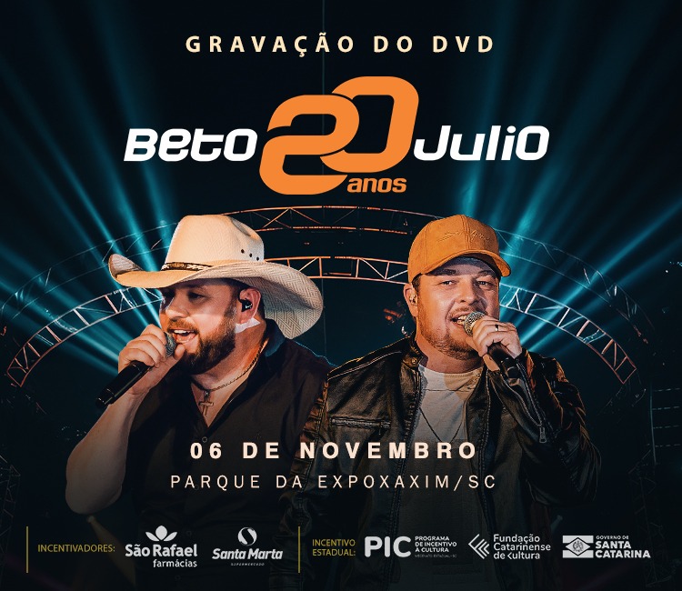 No dia 6 de novembro de 2025, a dupla sertaneja Beto & Julio grava o DVD “20 Anos” em sua cidade natal, Xaxim, no Oeste de Santa Catarina. O projeto marca duas décadas de trajetória musical e será realizado no Parque de Exposições da Expo Xaxim, com uma superprodução e estrutura de grande porte.