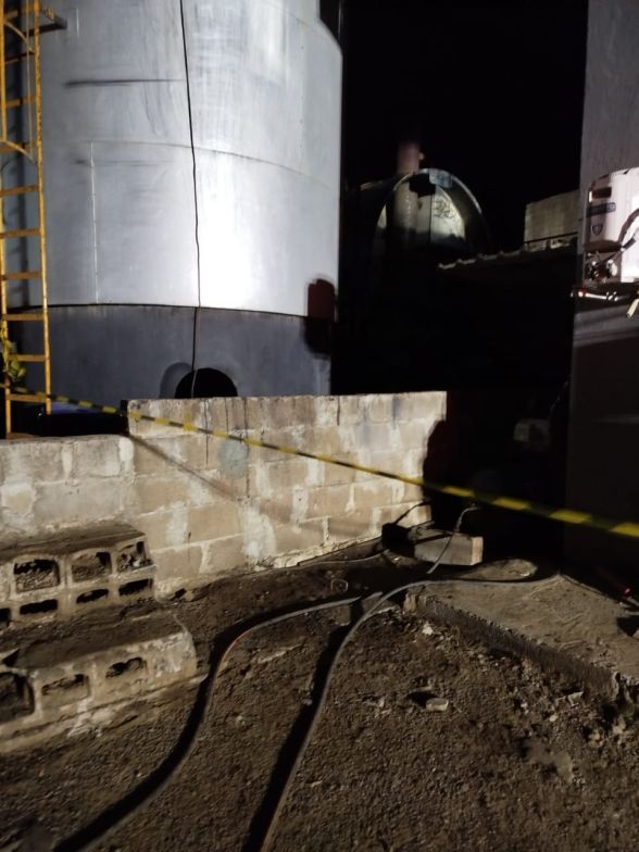 Ao chegar ao local, os bombeiros constataram que as chamas atingiam a parte externa do tanque, com vazamento de material e risco de explosão.