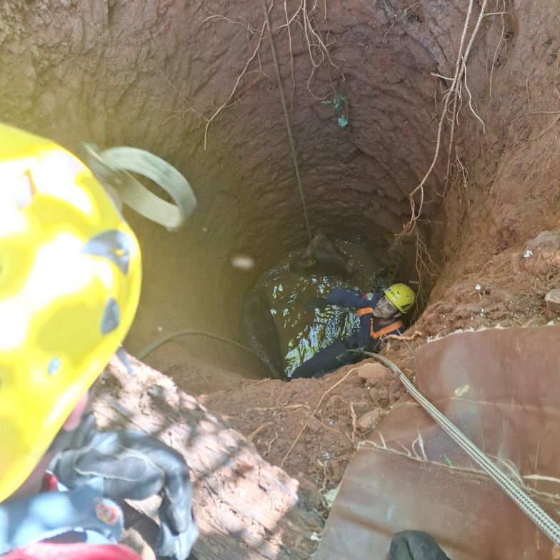 Para o resgate, a equipe realizou a descida no poço por meio de um sistema de rapel guiado. Em seguida, as pernas do animal foram amarradas com cintas de carga, permitindo o içamento seguro, realizado com o auxílio de um caminhão munck.