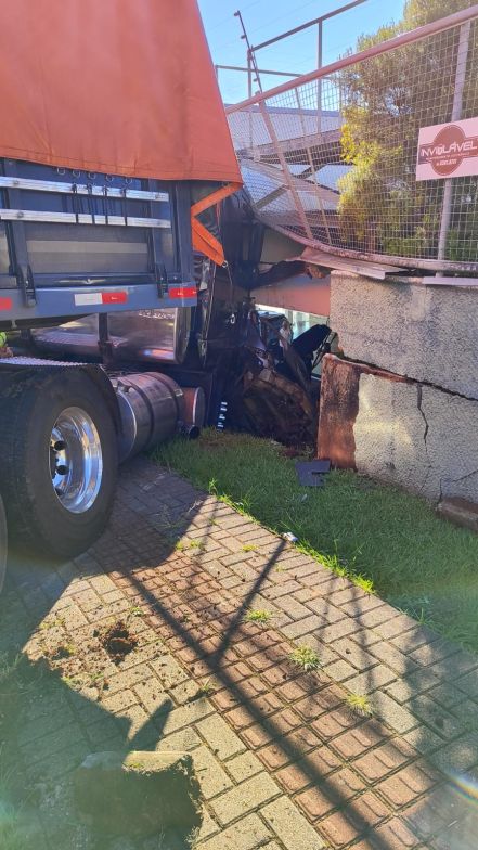 Veículo de carga desceu sozinho e prensou automóvel contra estrutura de uma edificação