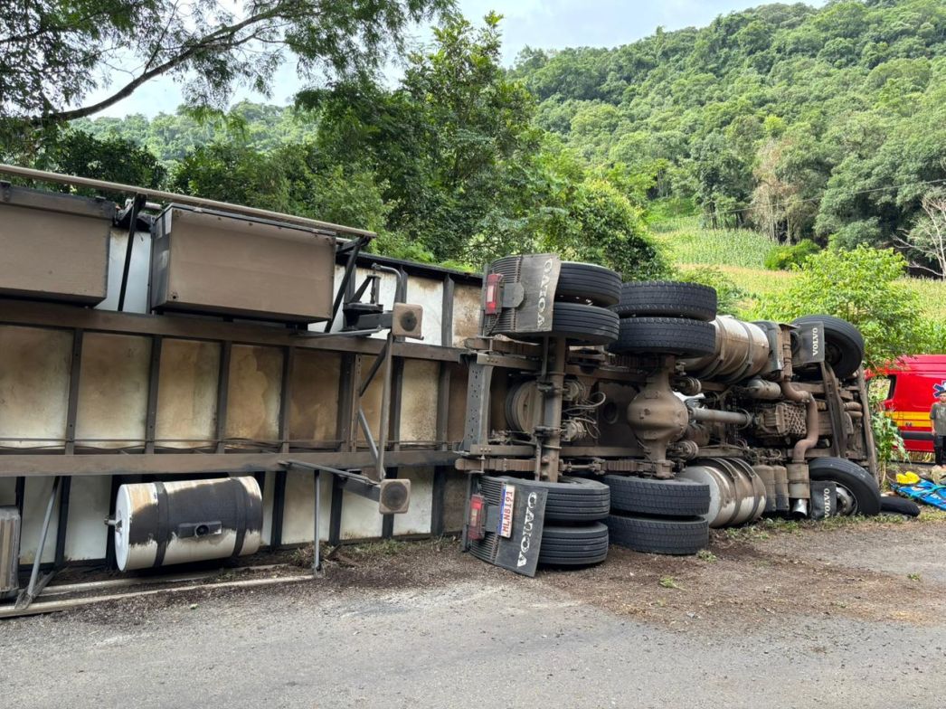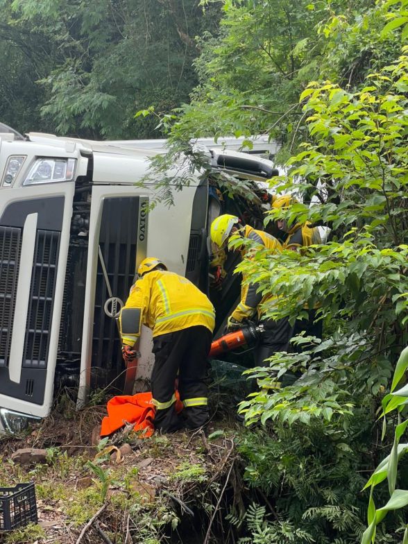 Capotamento de caminhão deixa motorista preso às ferragens na SC-283, em Seara
