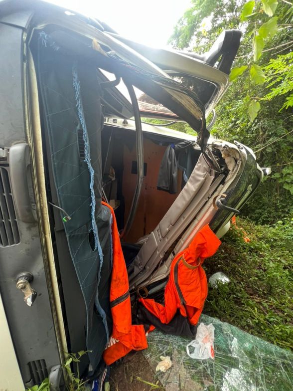 Segundo relato do motorista aos socorristas, o pneu dianteiro direito do caminhão estourou, o que fez com que ele perdesse o controle do veículo