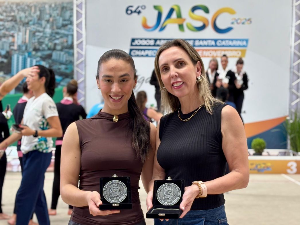 Outra agraciada com a medalha foi Daniela Zanini, que foi atleta e técnica da equipe. “Estou muito feliz pelo reconhecimento. Disputei meu primeiro JASC em 1988, ganhei medalha em 1991, em Chapecó, depois fui técnica da base e do rendimento por mais de 20 anos, até 2023. Fiquei muito grata esse mérito veio com muito esforço, valorizando quem é prata da casa”, disse Daniela.