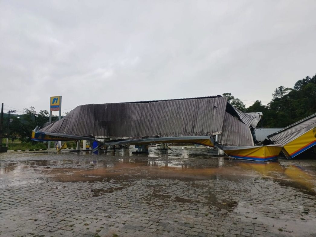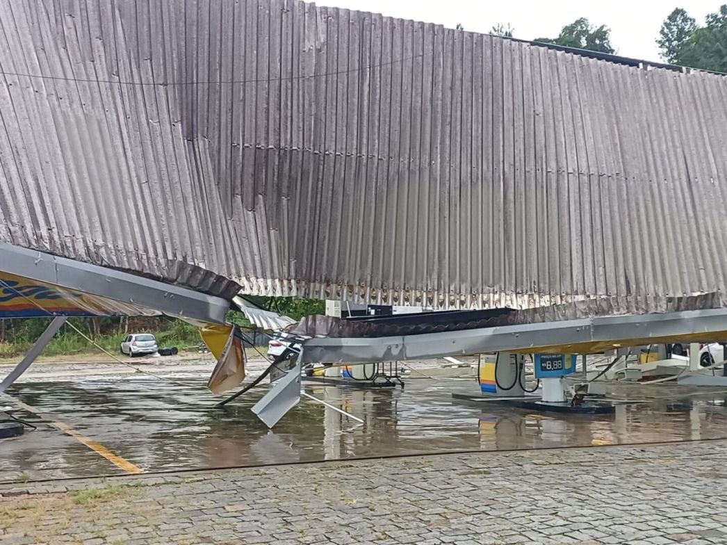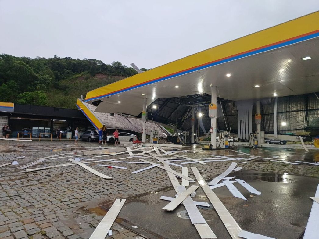 Cobertura de posto desaba com força de temporal e atinge carros em SC