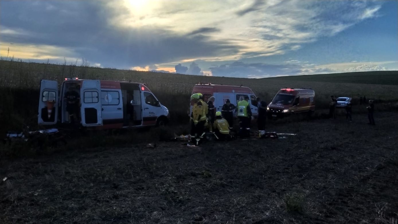 De acordo com as informações repassadas pelas equipes de socorro, o impacto da colisão foi tão forte que os ocupantes da motocicleta foram arremessados cerca de 15 metros, parando em uma lavoura às margens da via.