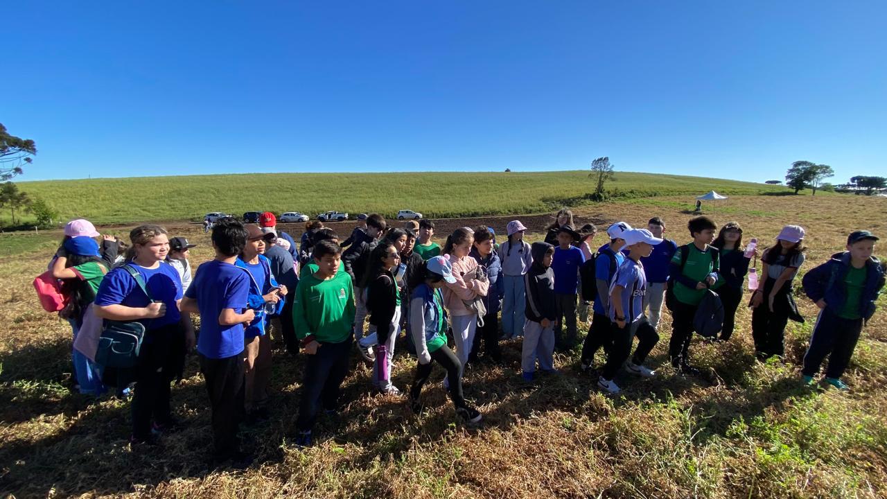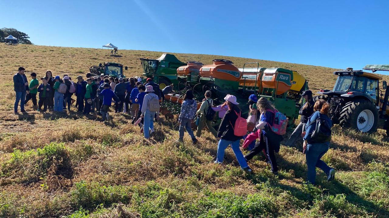 Durante a atividade, estudantes da pré-escola ao ensino médio participaram de estações temáticas na lavoura, que abordaram assuntos diversos, sempre adaptados à faixa etária dos participantes.