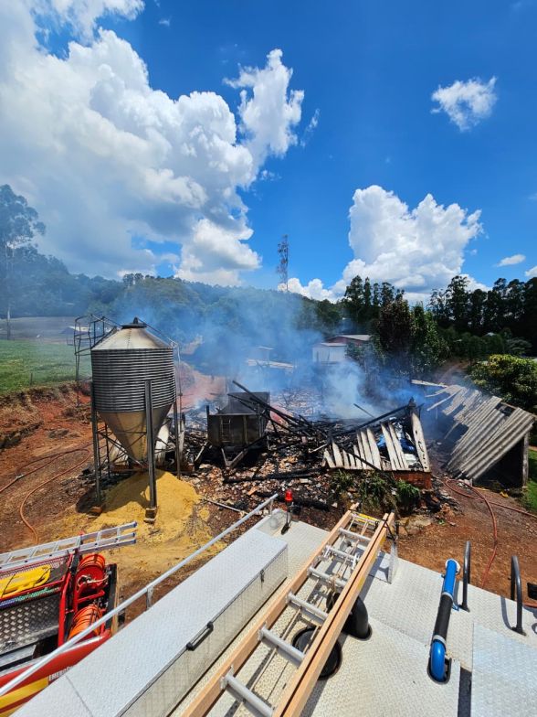 Ao chegarem ao local, os bombeiros encontraram moradores tentando controlar o fogo e retirar equipamentos agrícolas do interior da estrutura. A equipe realizou a avaliação inicial dos riscos, sendo informada pelo proprietário de que a energia elétrica já havia sido desligada. Em seguida, foi iniciada a montagem do estabelecimento e o combate às chamas.