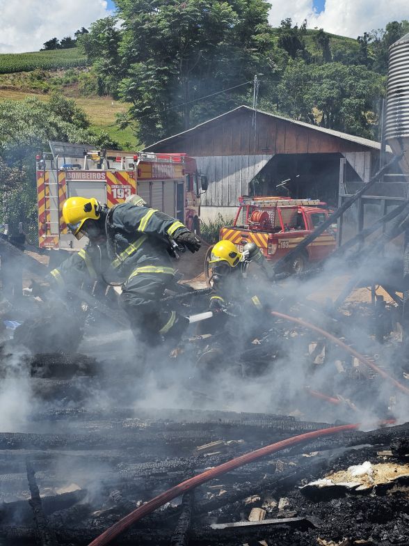 Um incêndio de grandes proporções destruiu um galpão agropastoril na Linha Medianeira, interior de São João do Oeste (SC), no início da tarde desta segunda-feira (24). O Corpo de Bombeiros Militar foi acionado às 12h24 para a ocorrência.