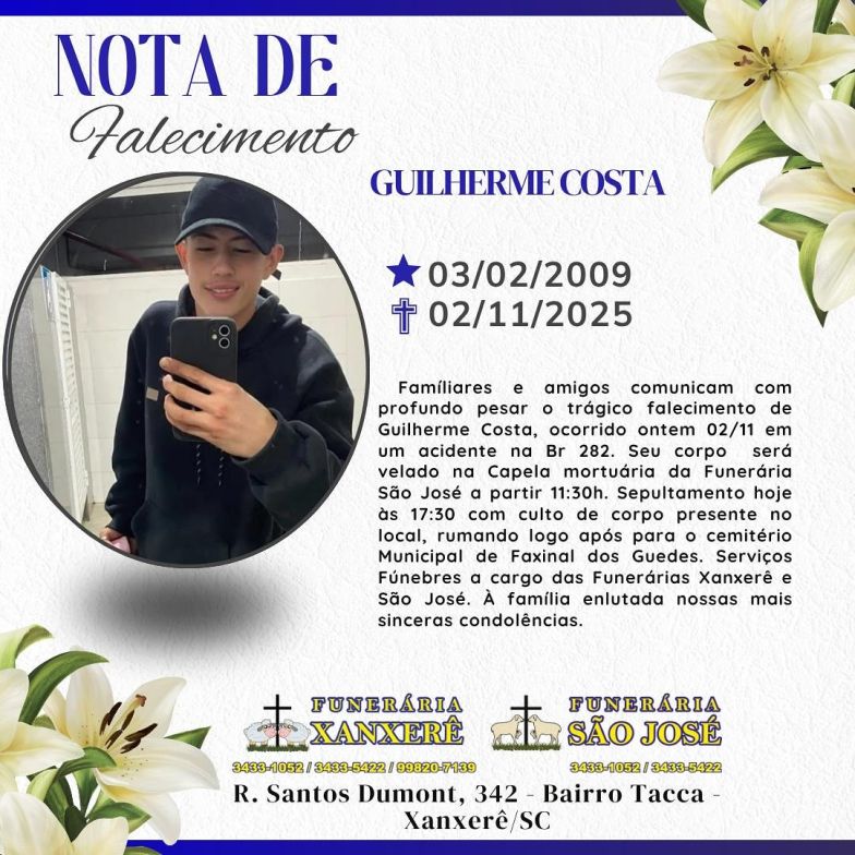 Guilherme será velado a partir das 11h30 na capela mortuária da Funerária São José. O sepultamento acontece nesta segunda-feira (03), às 17h30, no Cemitério Municipal de Faxinal dos Guedes. Informações sobre o velório e sepultamento de Rayani não foram divulgadas até o momento.