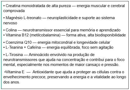 O CreatineDay é um suplemento desenvolvido com base na neurociência nutricional moderna. A fórmula combina: