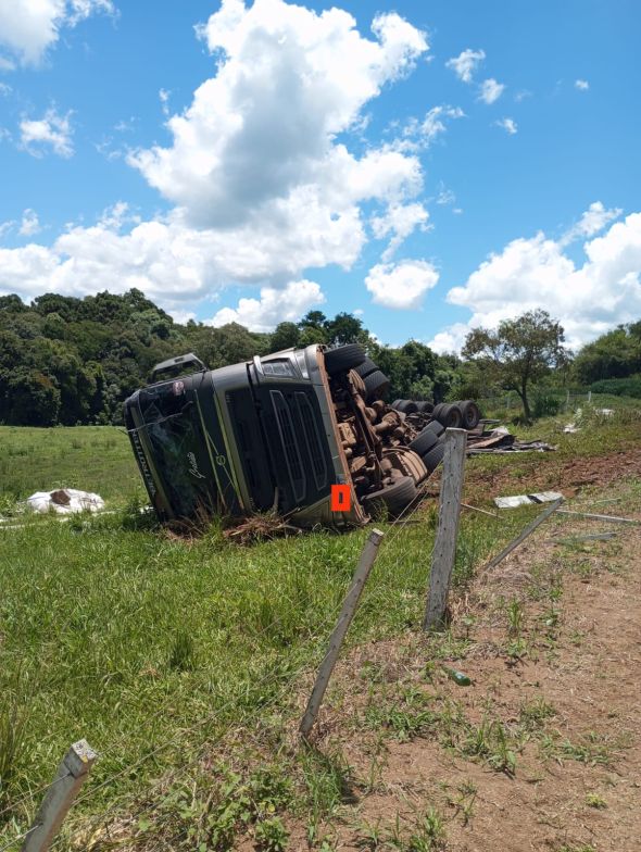 Motorista fica ferido após carreta sair da pista e tombar na SC-160