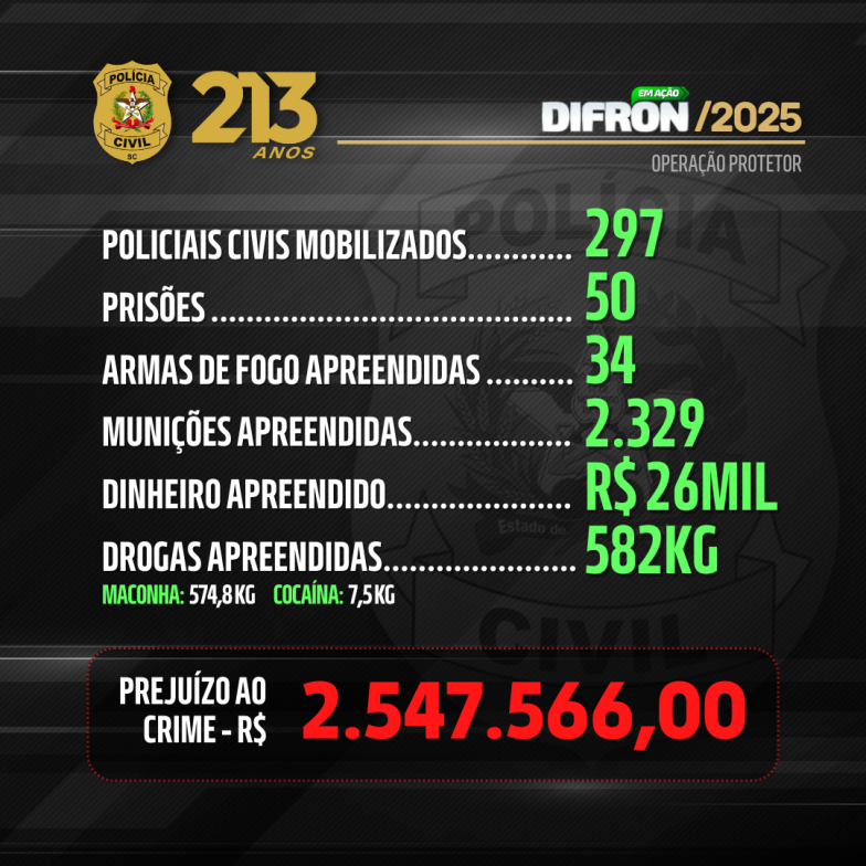 Em 2025 a Polícia Civil de Santa Catarina utilizou 297 Policiais Civis, efetuou 50 prisões, apreendeu 34 armas de fogo e 2.329 munições.