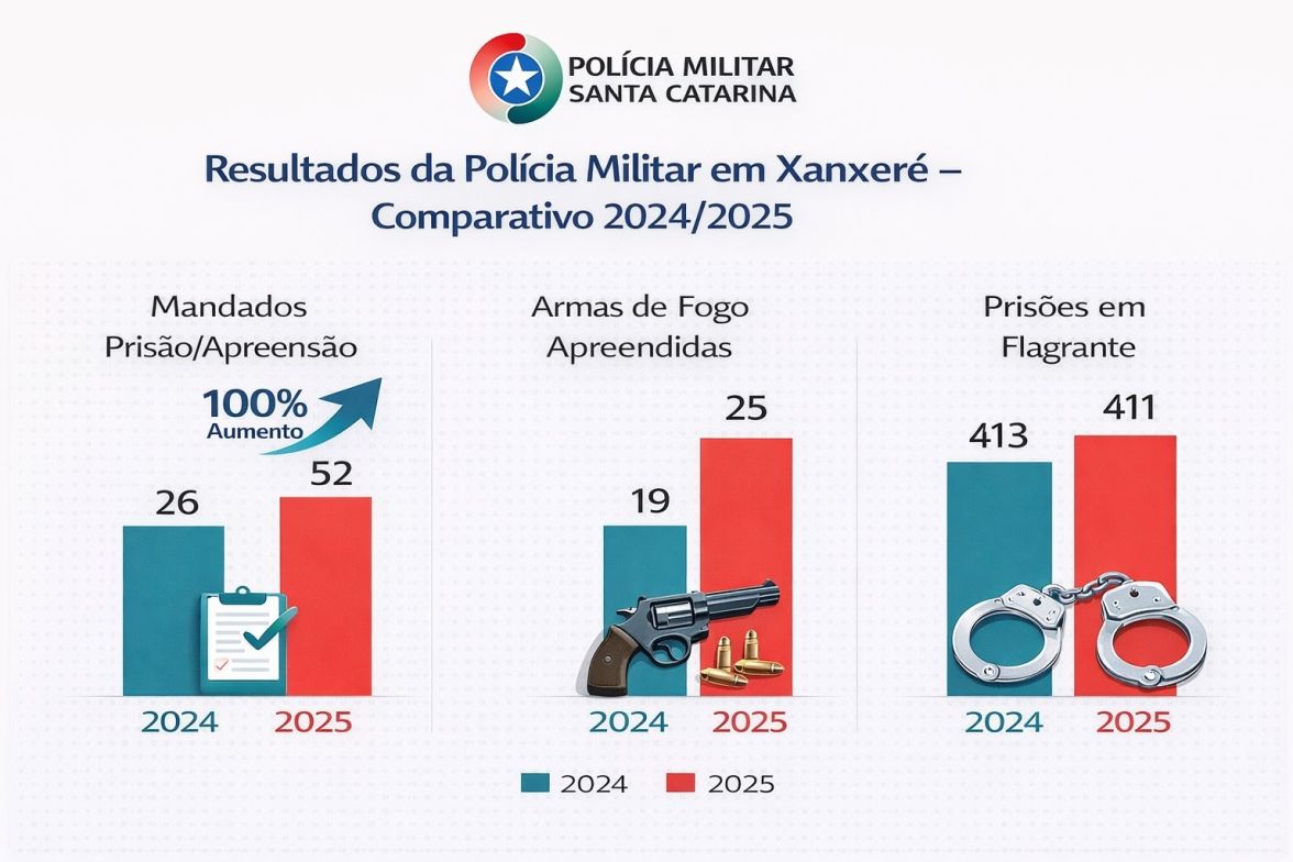 A Polícia Militar de Santa Catarina (PMSC), por meio do 30º Batalhão de Polícia Militar, divulgou os principais indicadores operacionais referentes ao município de Xanxerê, com dados comparativos entre os anos de 2024 e 2025. As informações demonstram o desempenho das ações ostensivas e preventivas desenvolvidas na região, reforçando o compromisso da corporação com a segurança da população.