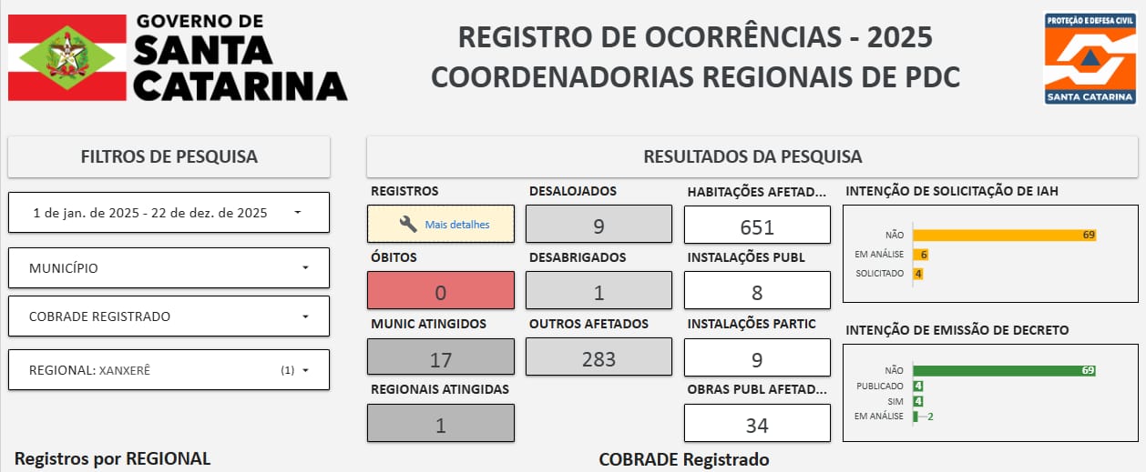 Em 2025, a Regional de Xanxerê liberou por meio da Secretaria de Estado da Proteção e Defesa Civil - SPDC R$ 4.387.695,02 em recursos diretamente aos municípios atendidos pela regional para ações de defesa civil, destinados ao enfrentamento da estiagem, ajuda humanitária, kits de transposição, aquisição de caminhão-pipa e apoio às ações de resposta e recuperação. Também foram investidos R$ 349.689,00 em ações de preparação, por meio do Programa Defesa Civil na Escola, que formou 2.843 alunos formados neste ano, fortalecendo a cultura de prevenção nas comunidades escolares.