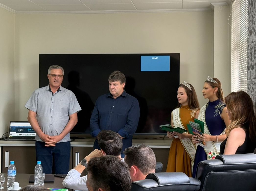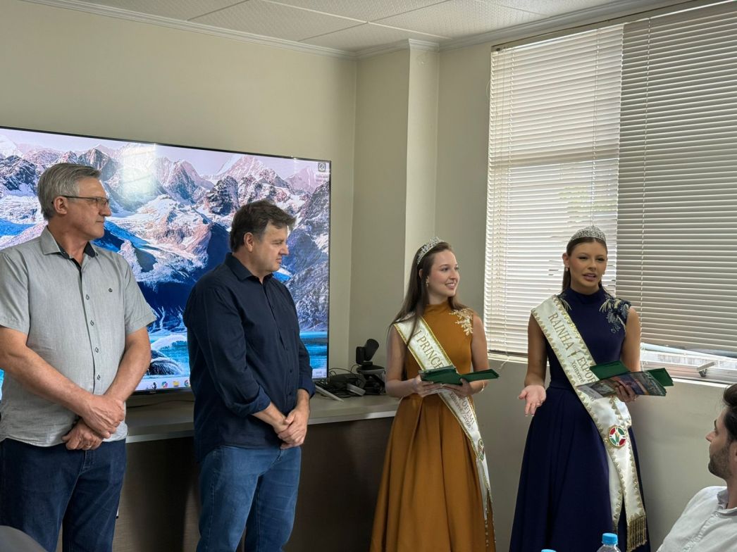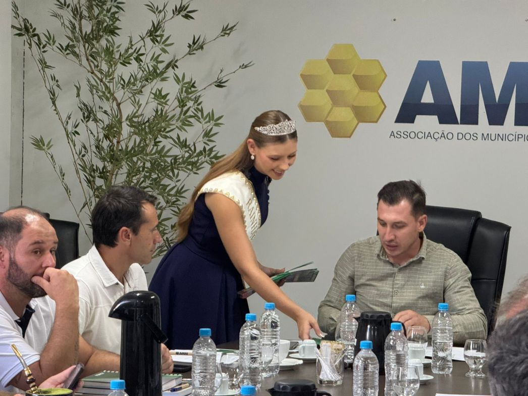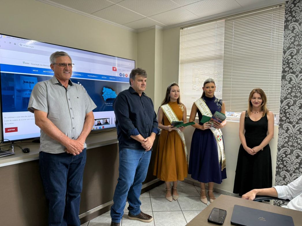 O presidente da Comissão Organizadora da ExpoFemi 2026, Irineu Altíssimo, e o vice-presidente, Romeu Roque Meneguzzi, juntamente com a Rainha Rayssa Kemely Padilha e a I Princesa Nathalia Menegolla, estiveram presentes na Associação dos Municípios do Alto Irani (AMAI) nesta quarta-feira (11), com o objetivo de convidar os prefeitos que contemplam a região para participar da feira.