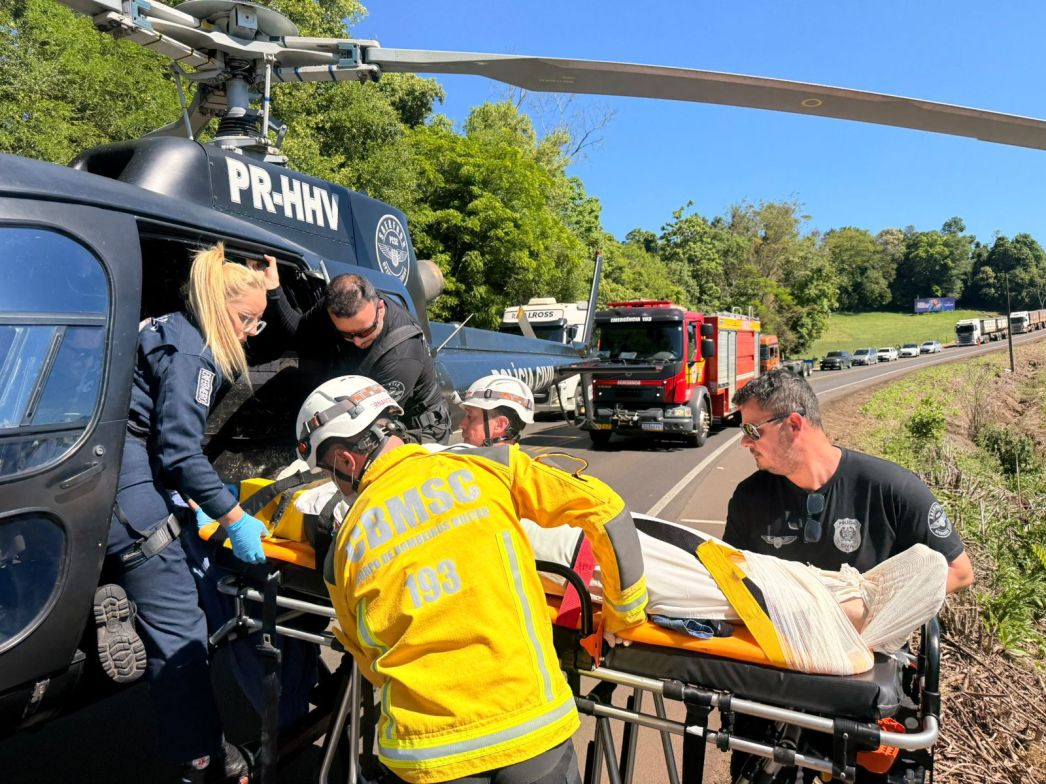 Segundo a Polícia Militar Rodoviária (PMRv), o trecho do acidente permaneceu totalmente interditado durante o atendimento aéreo.