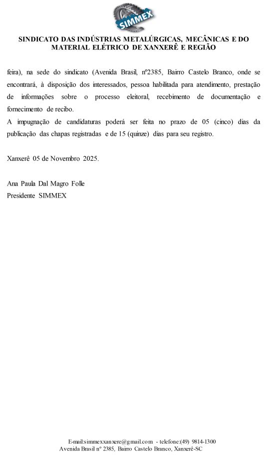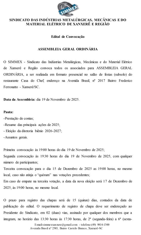 Sindicato das Indústrias Metalúrgicas, Mecânicas e do Material Elétrico de Xanxerê e Região convoca associados para Assembleia