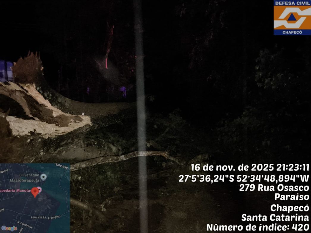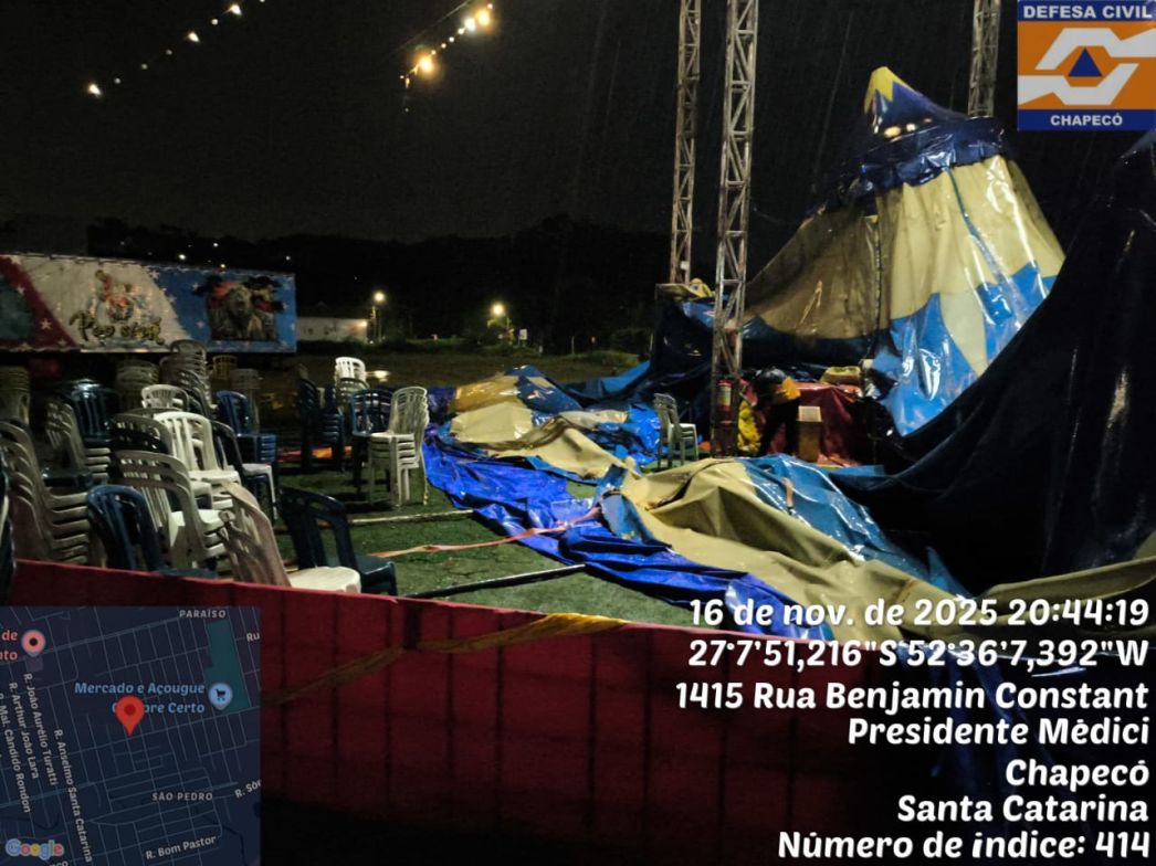 Temporal causa destelhamentos, quedas de árvores e danos em estrutura de circo em Chapecó