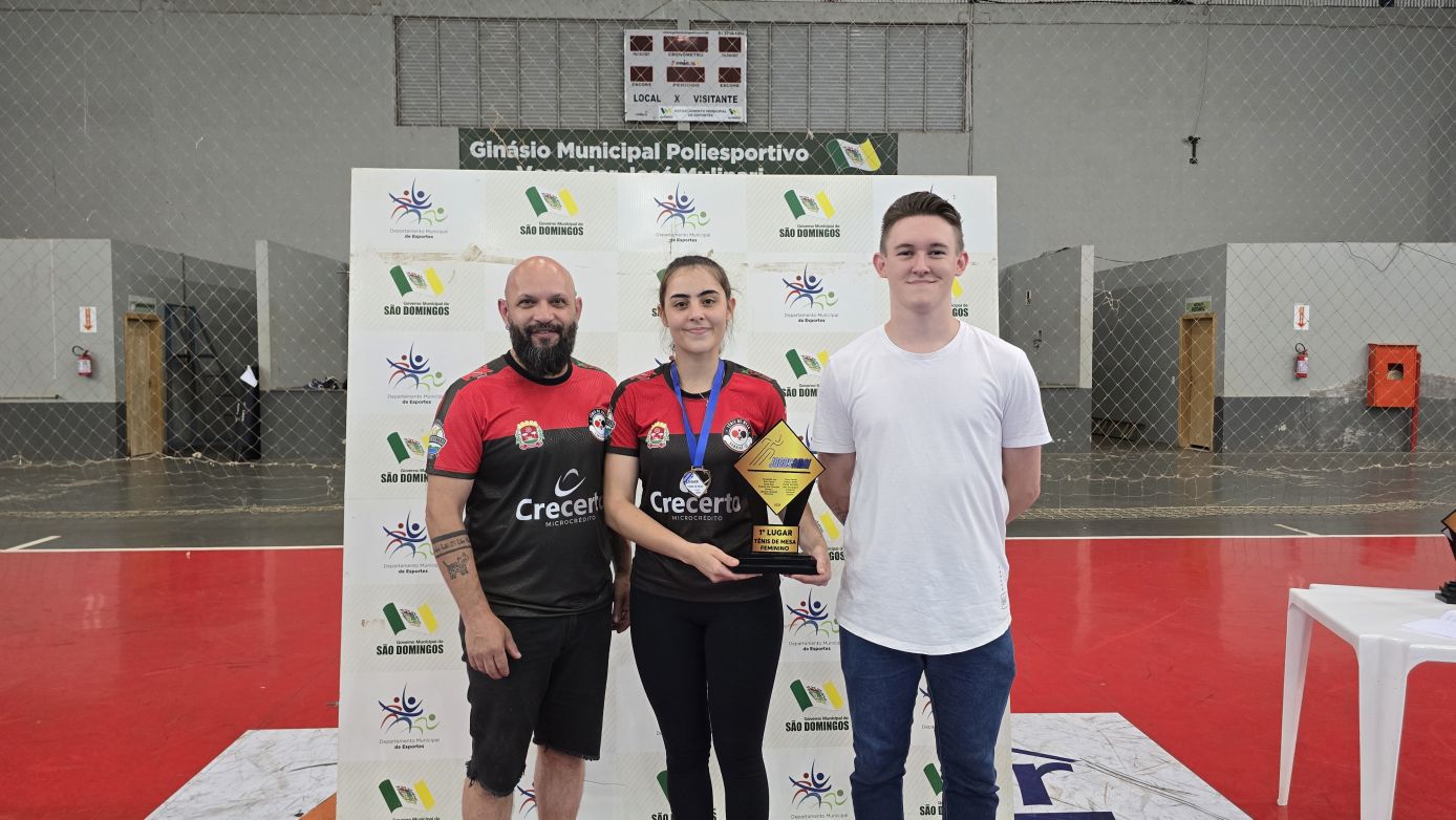 No feminino, a decisão reuniu Laiza Ferraz, de Xanxerê e Yara Thibes, de São Domingos, que vinham de uma boa fase inicial. Laiza manteve o ritmo forte desde o primeiro confronto, mostrou técnica e venceu a final por 4 a 2, tornando-se a campeã da categoria feminina. Sua consistência e precisão nas jogadas foram determinantes para a conquista.