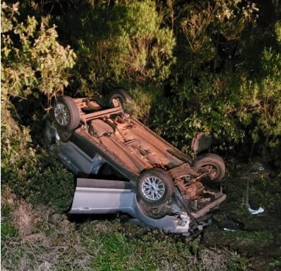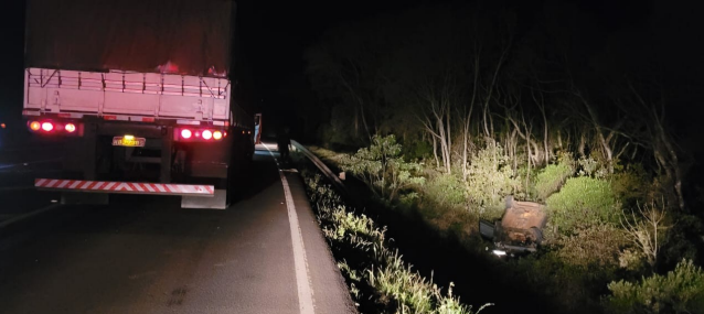 Carro colidiu contra um caminhão, saiu da pista e acabou capotando
